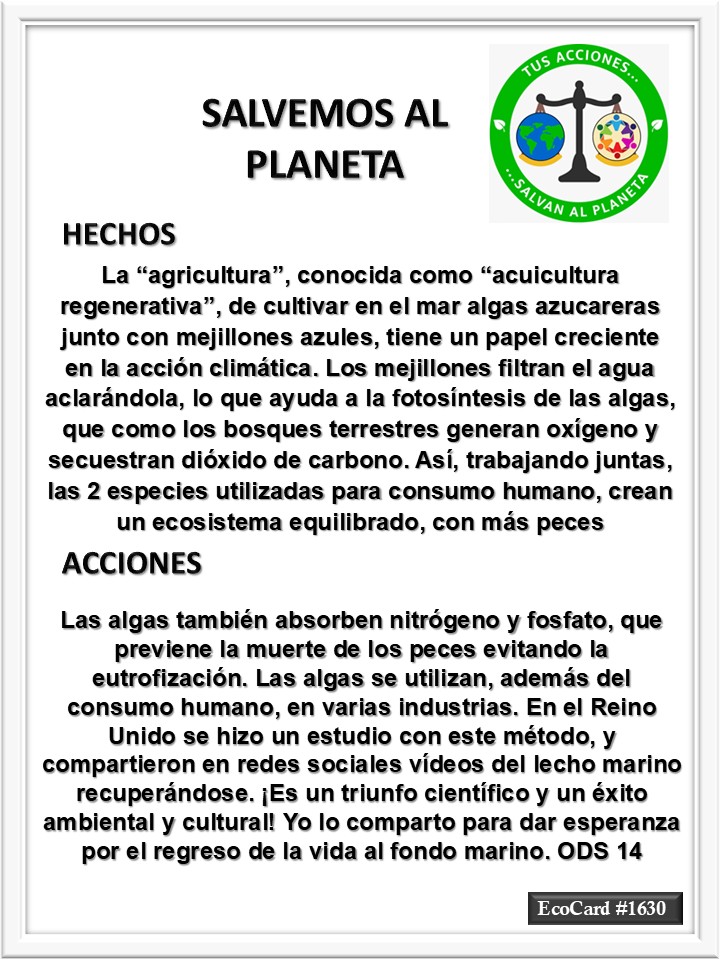 EcoCard #1630 Acuicultura regenerativa José Antonio Cárdenas Marroquín Uncategorized May 14, 2025May 14, 2025 1 Minute Lydia P. Vignau y José A. Cárdenas Más información: Growing Seaweed and Mussels Together Could Be a Powerful Climate Solution Share this: Click to share on X (Opens in new window) X Click to share on Facebook (Opens in new window) Facebook Like Loading... Published May 14, 2025May 14, 2025