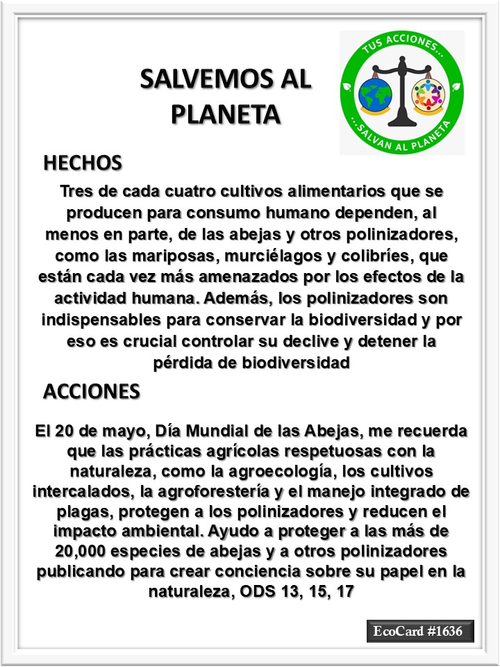 EcoCard #1636 Día Mundial de las Abejas José Antonio Cárdenas Marroquín Uncategorized May 20, 2025 1 Minute Lydia P. Vignau y José A. Cárdenas Más información: World Bee Day – 20 MayShare this: Share on X (Opens in new window) X Share on Facebook (Opens in new window) Facebook Like Loading... Published May 20, 2025