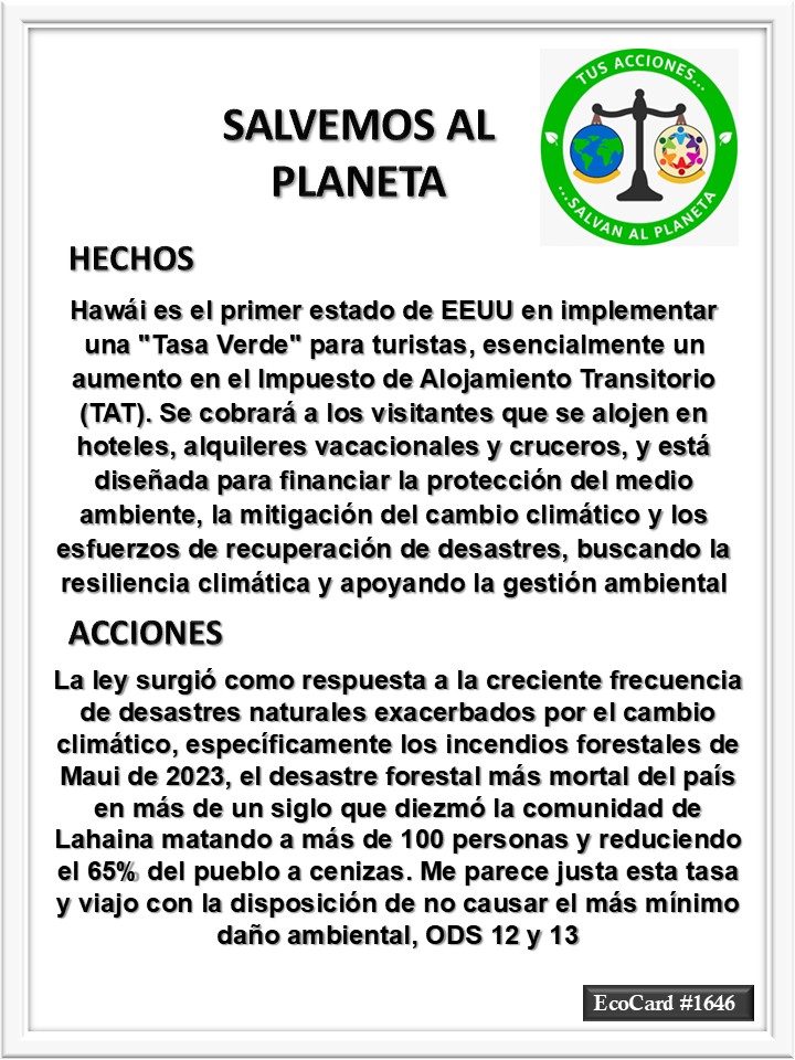 EcoCard #1646 Tasa verde José Antonio Cárdenas Marroquín Uncategorized May 30, 2025 1 Minute Lydia P. Vignau y José A. Cárdenas Más información: Hawaii becomes first US state to charge ‘Green Fee’ on tourists Share this: Click to share on X (Opens in new window) X Click to share on Facebook (Opens in new window) Facebook Like Loading... Published May 30, 2025