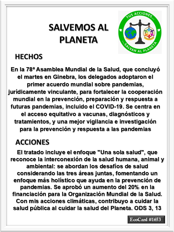 EcoCard #1653 Una sola salud José Antonio Cárdenas Marroquín Uncategorized June 7, 2025 1 Minute Lydia P. Vignau y José A. Cárdenas Más información: Pandemics to pollution: WHO Assembly delivers landmark health decisions Share this: Share on X (Opens in new window) X Share on Facebook (Opens in new window) Facebook Like Loading... Published June 7, 2025