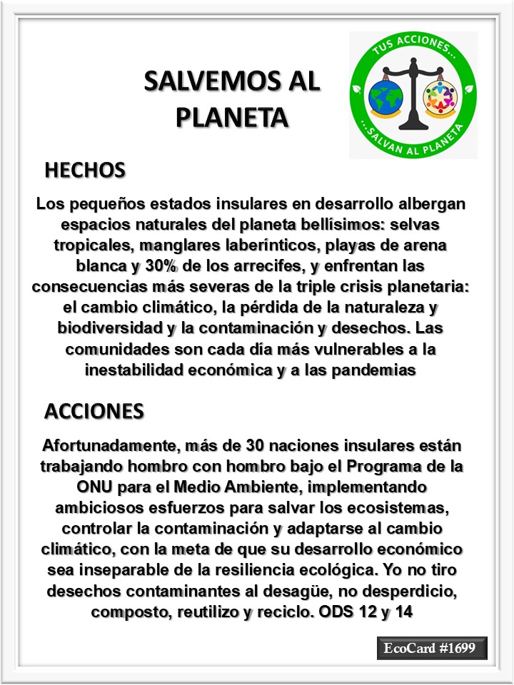 EcoCard #1699 Las naciones insulares José Antonio Cárdenas Marroquín Uncategorized August 1, 2025 1 Minute Lydia P. Vignau y José A. Cárdenas Más información: From ridges to reefs, small island states lead with big environmental moves Share this: Click to share on X (Opens in new window) X Click to share on Facebook (Opens in new window) Facebook Like Loading... Published August 1, 2025