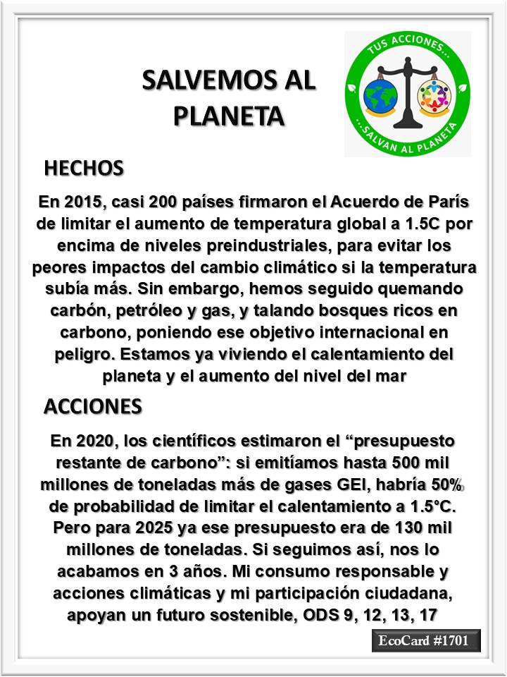 EcoCard #1701 Mi consumo responsable José Antonio Cárdenas Marroquín Uncategorized August 3, 2025 1 Minute Lydia P. Vignau y José A. Cárdenas Más información: Three years left to limit warming to 1.5C, leading scientists warn Share this: Click to share on X (Opens in new window) X Click to share on Facebook (Opens in new window) Facebook Like Loading... Published August 3, 2025