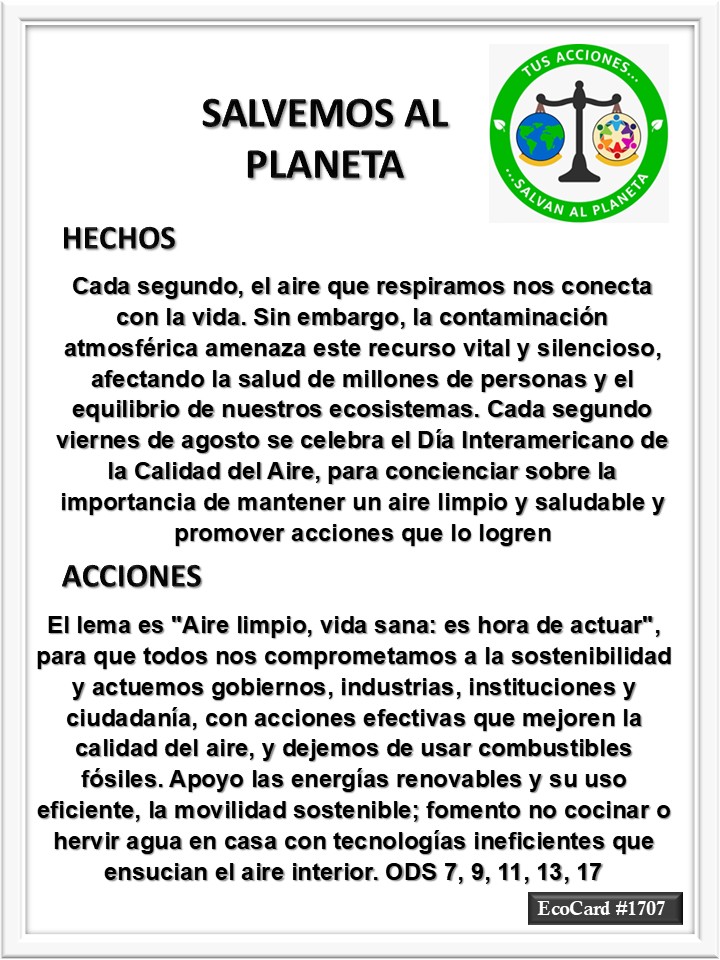 EcoCard #1707 Aire limpio, vida sana José Antonio Cárdenas Marroquín Uncategorized August 9, 2025 1 Minute Lydia P. Vignau y José A. Cárdenas Más información: Día Interamericano de la Calidad del Aire Share this: Click to share on X (Opens in new window) X Click to share on Facebook (Opens in new window) Facebook Like Loading... Published August 9, 2025