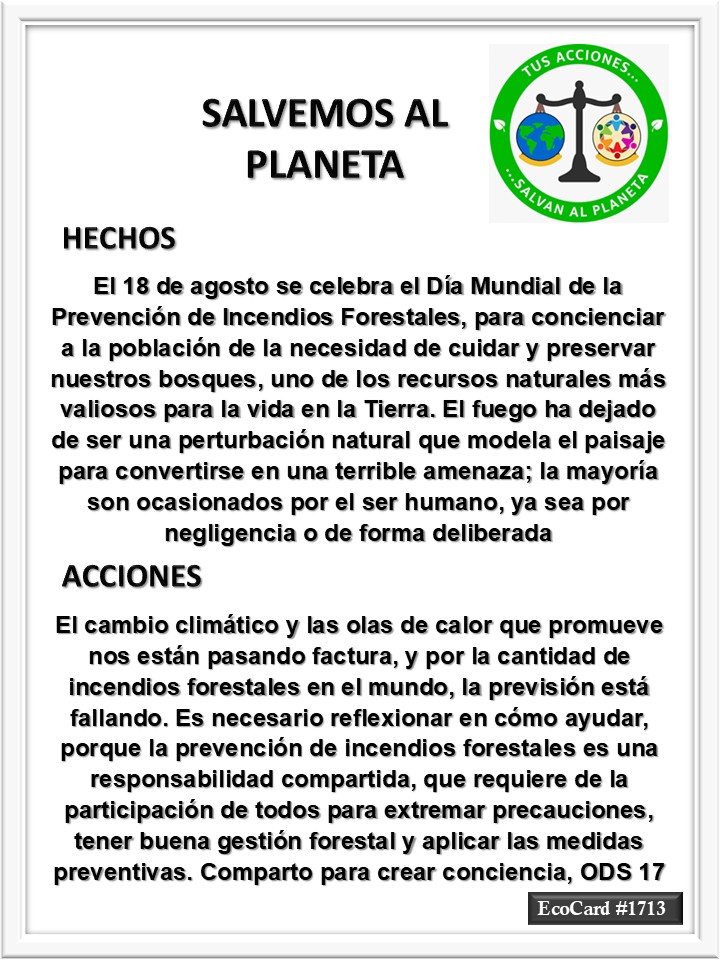EcoCard #1713 Incendios forestales José Antonio Cárdenas Marroquín Uncategorized August 18, 2025 1 Minute Lydia P. Vignau y José A. Cárdenas Más información: 18 de agosto, Día Mundial de la Prevención de Incendios Forestales Share this: Share on X (Opens in new window) X Share on Facebook (Opens in new window) Facebook Like Loading... Published August 18, 2025