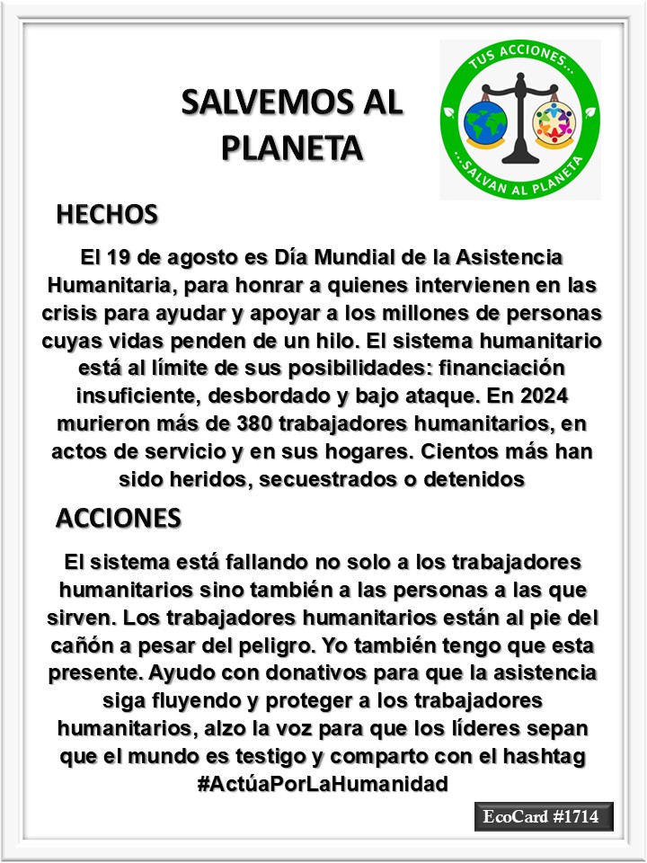EcoCard #1714 Asistencia humanitaria José Antonio Cárdenas Marroquín Uncategorized August 19, 2025 1 Minute Lydia P. Vignau y José A. Cárdenas Más información: Una amenaza silenciosa Más información: Día Mundial de la Asistencia Humanitaria Share this: Share on X (Opens in new window) X Share on Facebook (Opens in new window) Facebook Like Loading... Published August 19, 2025