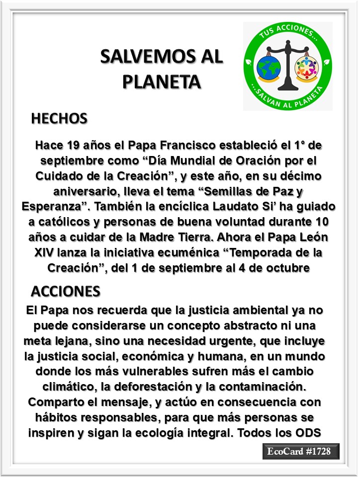 EcoCard #1728 Por el cuidado de la creación José Antonio Cárdenas Marroquín Uncategorized September 2, 2025 1 Minute Lydia P. Vignau y José A. Cárdenas Más información: FOR THE 10th WORLD DAY OF PRAYERFOR THE CARE OF CREATION 2025 Share this: Share on X (Opens in new window) X Share on Facebook (Opens in new window) Facebook Like Loading... Published September 2, 2025