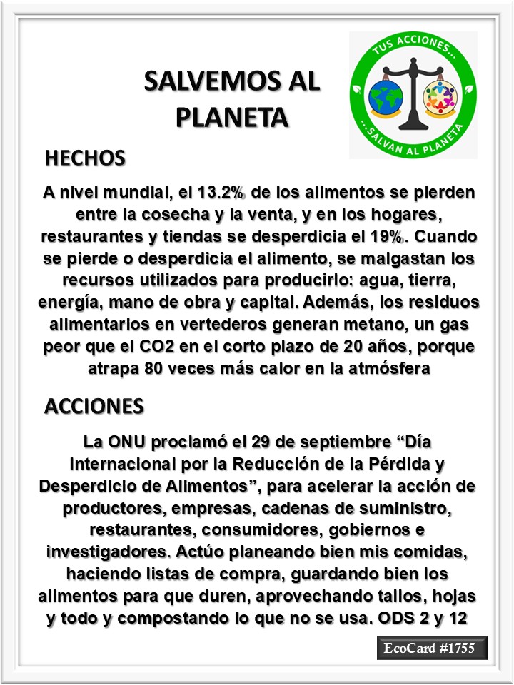EcoCard #1755 Pérdida y desperdicio José Antonio Cárdenas Marroquín Uncategorized September 29, 2025 1 Minute Lydia P. Vignau y José A. Cárdenas Más información: International Day of Awareness on Food Loss and Waste Reduction – 29 September Share this: Share on X (Opens in new window) X Share on Facebook (Opens in new window) Facebook Like Loading... Published September 29, 2025