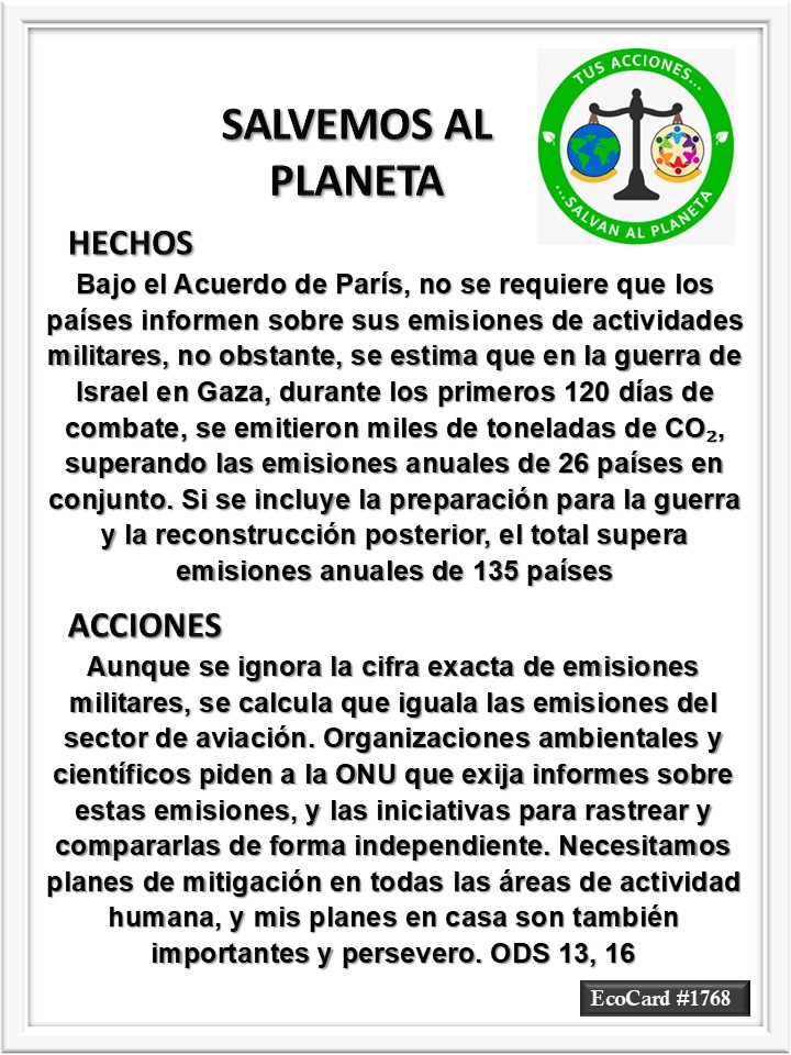 EcoCard #1768 Actividades militares José Antonio Cárdenas Marroquín Uncategorized October 15, 2025 1 Minute Lydia P. Vignau y José A. Cárdenas Más información: How Are Wars Affecting Climate Change? Share this: Share on X (Opens in new window) X Share on Facebook (Opens in new window) Facebook Like Loading... Published October 15, 2025