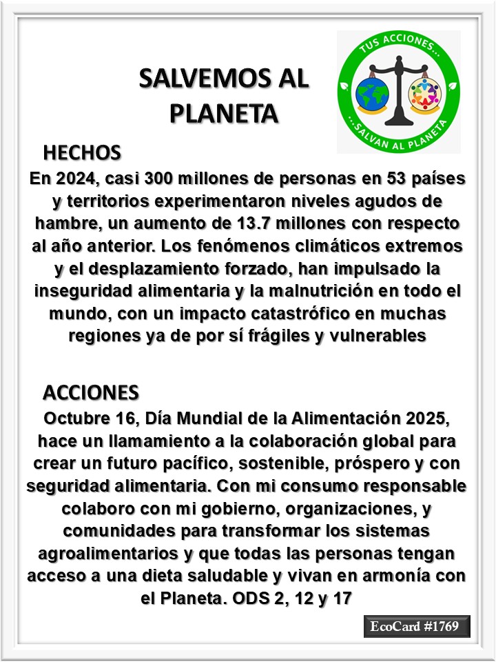 EcoCard #1769 Seguridad alimentaria José Antonio Cárdenas Marroquín Uncategorized October 16, 2025 1 Minute Lydia P. Vignau y José A. Cárdenas Más información: World Food Day 2025 Más información: Global Report on Food Crises (GRFC) 2025 Share this: Share on X (Opens in new window) X Share on Facebook (Opens in new window) Facebook Like Loading... Published October 16, 2025