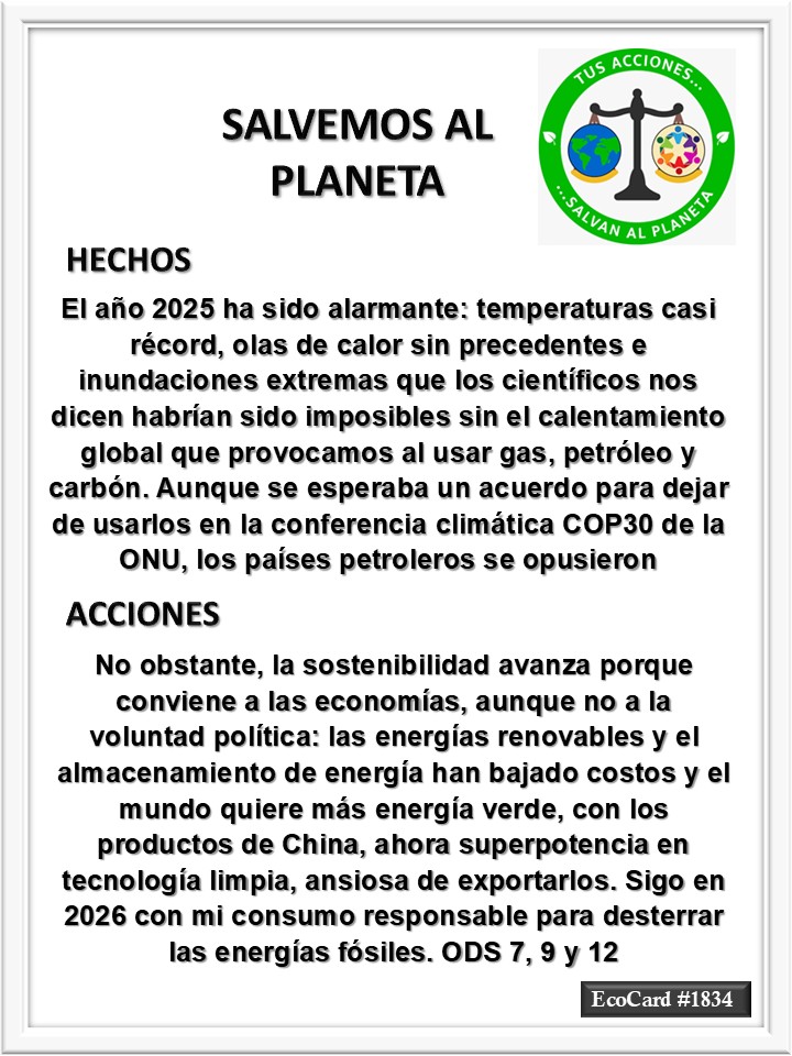 EcoCard #1834 Consumo responsable José Antonio Cárdenas Marroquín Uncategorized December 28, 2025 1 Minute Lydia P. Vignau y José A. Cárdenas Más información: How 2025 Broke The Traditional Climate Agenda Share this: Click to share on X (Opens in new window) X Click to share on Facebook (Opens in new window) Facebook Like Loading... Published December 28, 2025