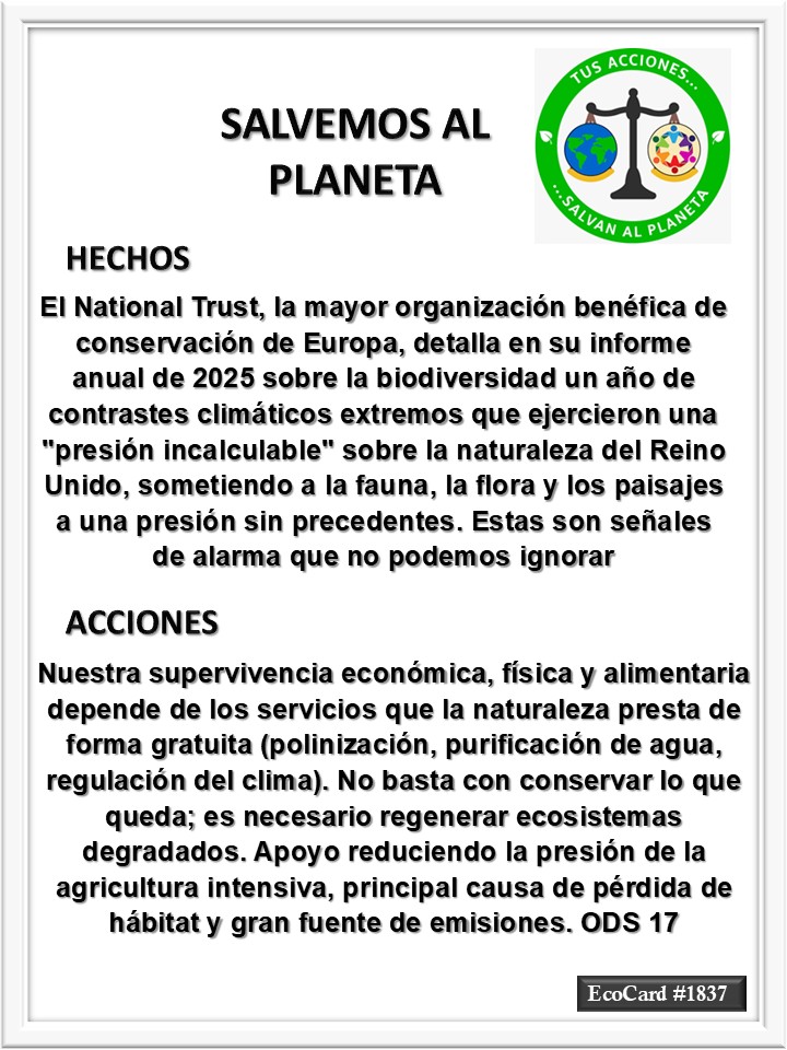 EcoCard #1837 Nuestra supervivencia José Antonio Cárdenas Marroquín Uncategorized December 31, 2025 1 Minute Lydia P. Vignau y José A. Cárdenas Más información: Heat, drought and fire: how extreme weather pushed nature to its limits in 2025 Share this: Click to share on X (Opens in new window) X Click to share on Facebook (Opens in new window) Facebook Like Loading... Published December 31, 2025