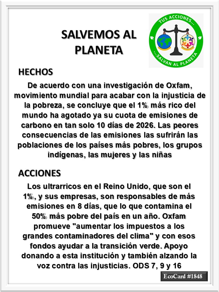EcoCard #1848 Injusticia de la pobreza José Antonio Cárdenas Marroquín Uncategorized January 13, 2026 1 Minute Lydia P. Vignau y José A. Cárdenas Más información: ‘World’s richest 1% have already used fair share of emissions for 2026, says Oxfam Share this: Click to share on X (Opens in new window) X Click to share on Facebook (Opens in new window) Facebook Like Loading... Published January 13, 2026