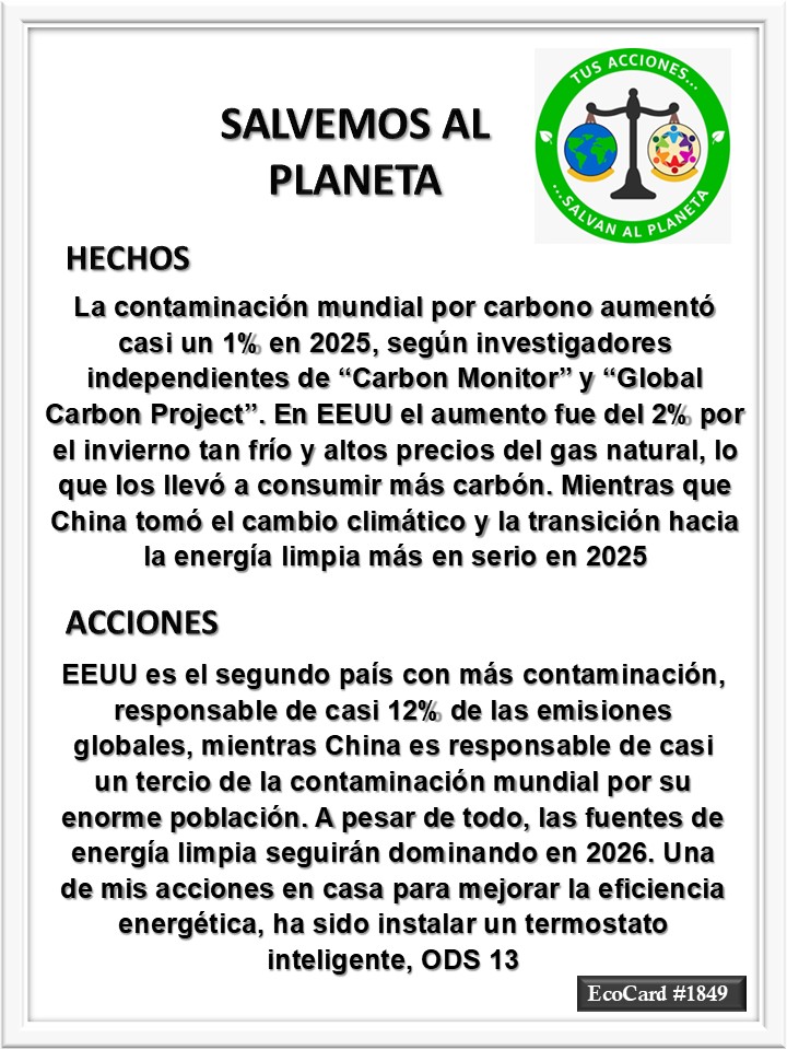 EcoCard #1849 Emisiones globales José Antonio Cárdenas Marroquín Uncategorized January 14, 2026January 14, 2026 1 Minute Lydia P. Vignau y José A. Cárdenas Más información: Where things stand on climate change in 2026 Share this: Click to share on X (Opens in new window) X Click to share on Facebook (Opens in new window) Facebook Like Loading... Published January 14, 2026January 14, 2026