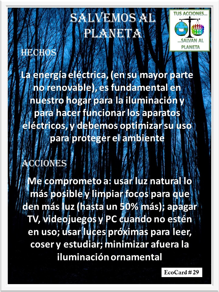Utilizando la energía eléctrica con mesura, ayudamos a contener y eventualmente revertir el Calentamiento Global, que se ha convertido ya en una “Emergencia Climática: extrapolando los datos históricos, podemos decir que diariamente se extinguen unas 100 especies animales y vegetales; desaparecen 50,000 hectáreas de selvas tropicales; los desiertos avanzan 20,000 hectáreas. Cada 24 horas liberamos a la atmósfera otros 100 millones de toneladas de gases de efecto invernadero, que coadyuva al incremento global de la temperatura del planeta.