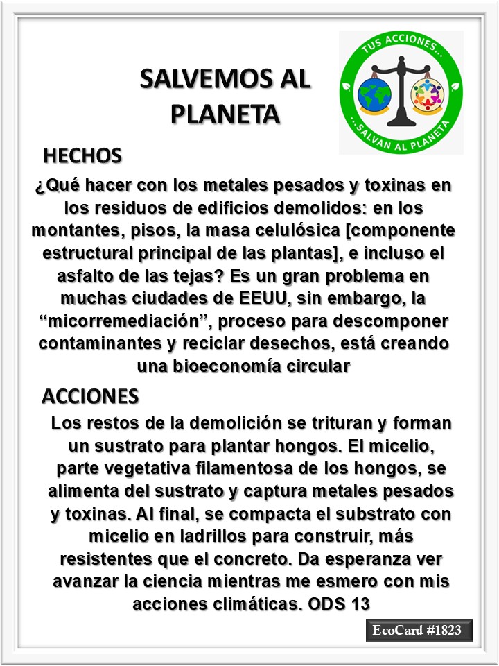 EcoCard #1823 Demoliciones Lydia P. Vignau y José A. Cárdenas Más información: Scientists uncover potentially game-changing universal new benefit after planting mushrooms: ‘Unsung hero’ Más información: These mushroom bricks are up to twice as strong as concrete