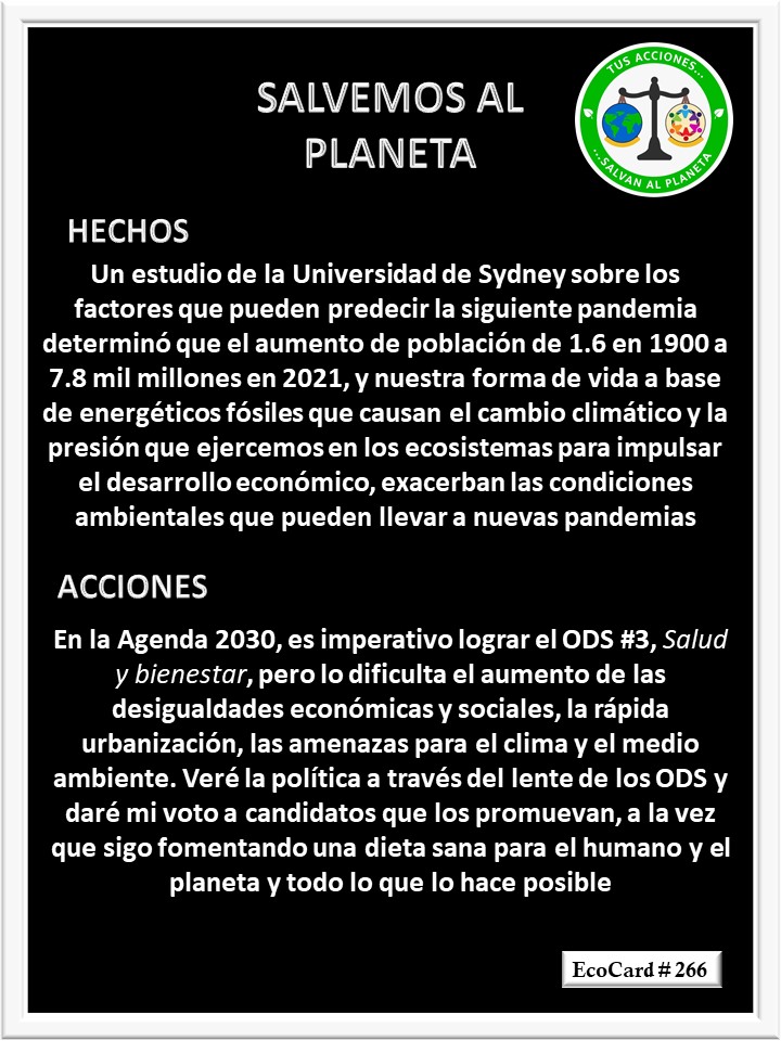 EcoCard # 266 El lente de los ODS Lydia P. Vignau y José A. Cárdenas Más Información: Climate change and disease spread Más Información: Salud y Bienestar