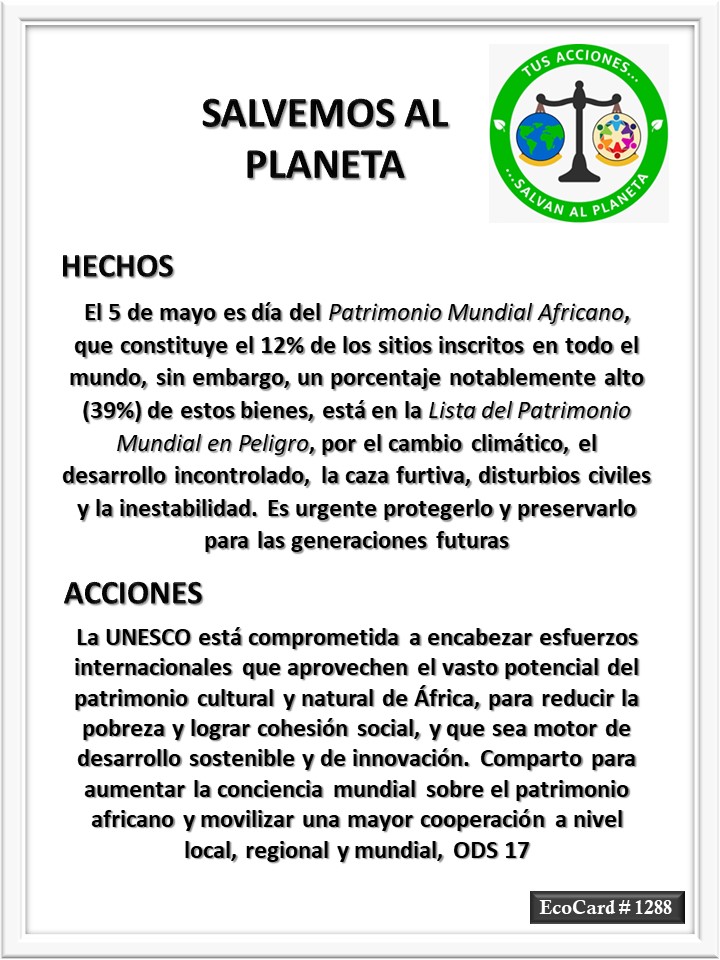 EcoCard #1288 Patrimonio mundial en peligro Lydia P. Vignau y José A. Cárdenas Más información: Día del Patrimonio Mundial Africano